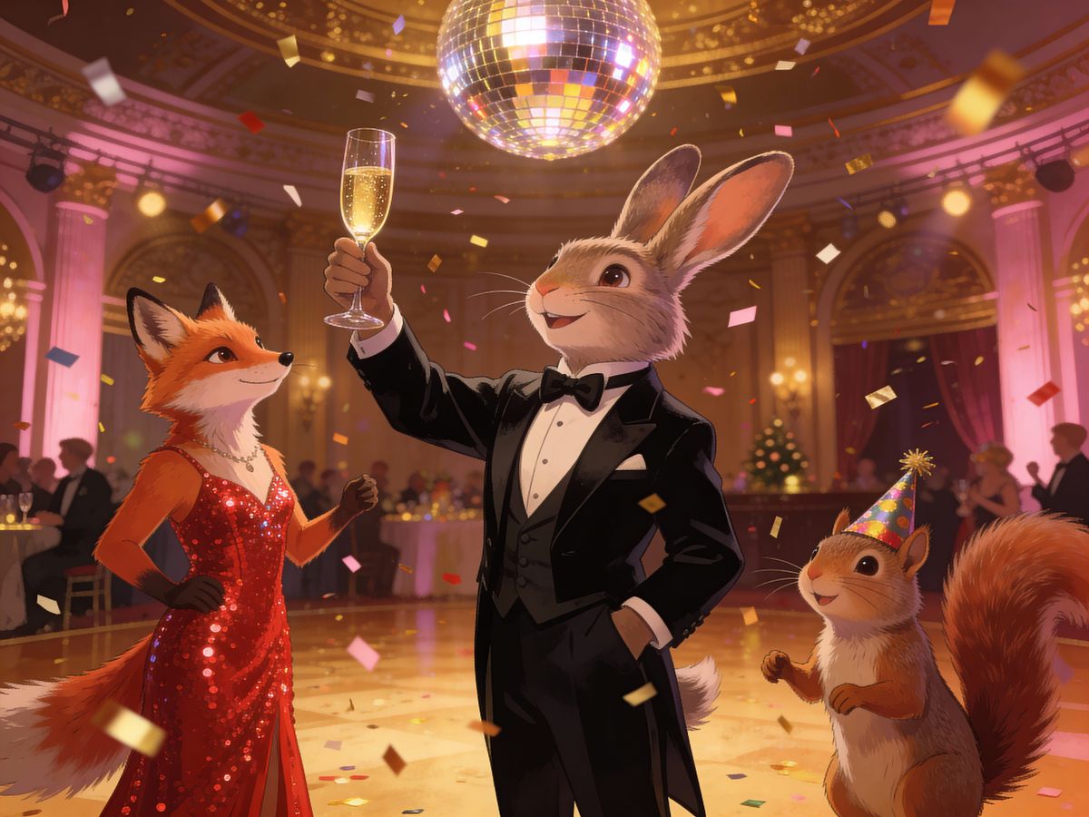 A dapper rabbit and other animals celebrate New Years Eve together with humans at a grand party.