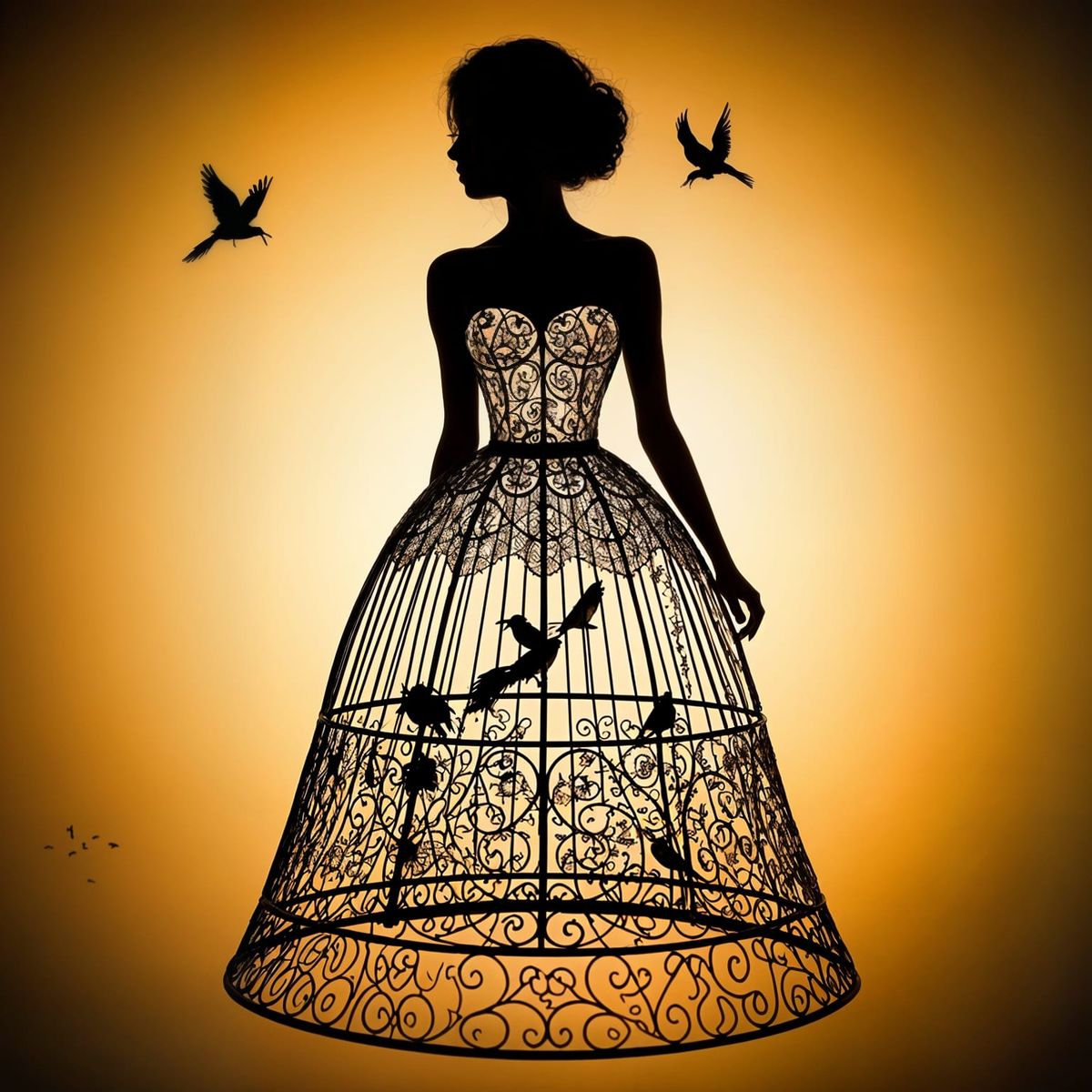 A striking picture of a woman's upper body merging into a bell-shaped wrought iron cage resembling a dress, complete with intricate details and delicate birds.