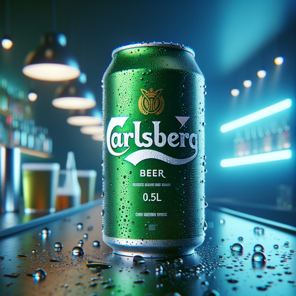 A photorealistic image showcases a 0.5L Carlsberg beer can with condensation, embodying freshness. The backdrop suggests a modern, minimalist bar with cool neon lighting, capturing a refreshing and stylish moment of relaxation.