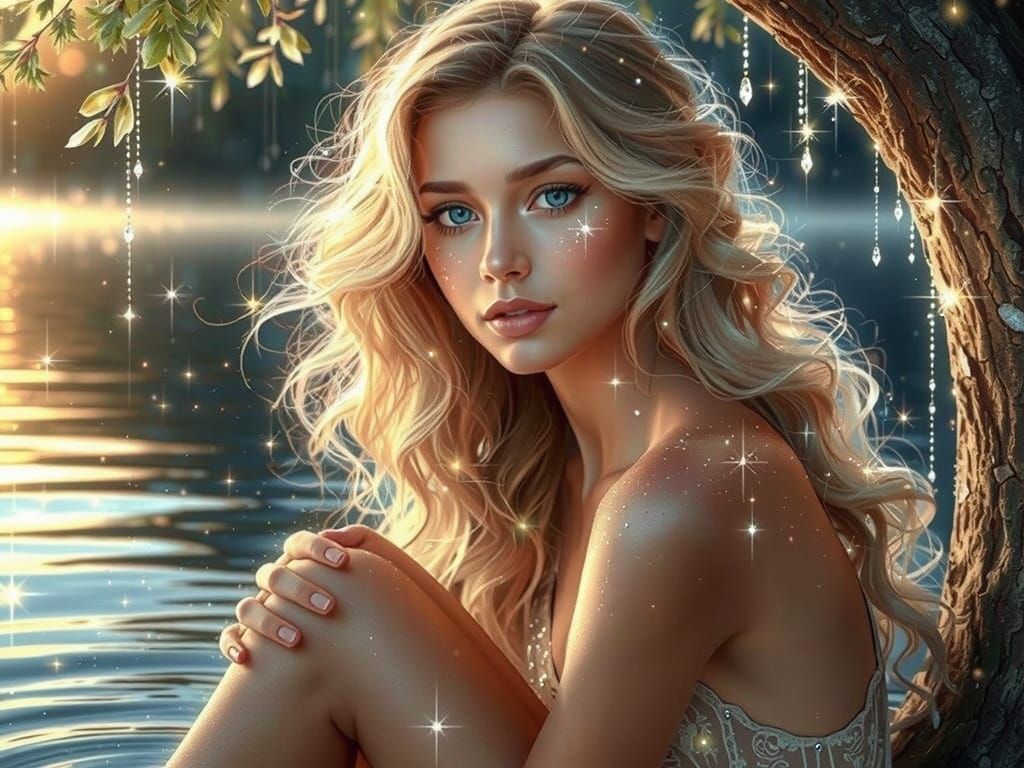 A captivating image displays a blonde woman with long, wavy hair seated on a tree near calm water. The scene is enhanced with sparkling light, rendered in soft golds, grays, and blues, with watercolor textures.
