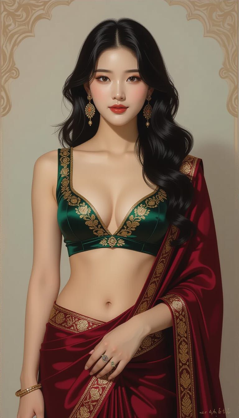 A digital painting of a beautiful young Korean woman with fair skin and long, wavy black hair. She wears a revealing Indian-style blouse and saree, showcasing her figure.
