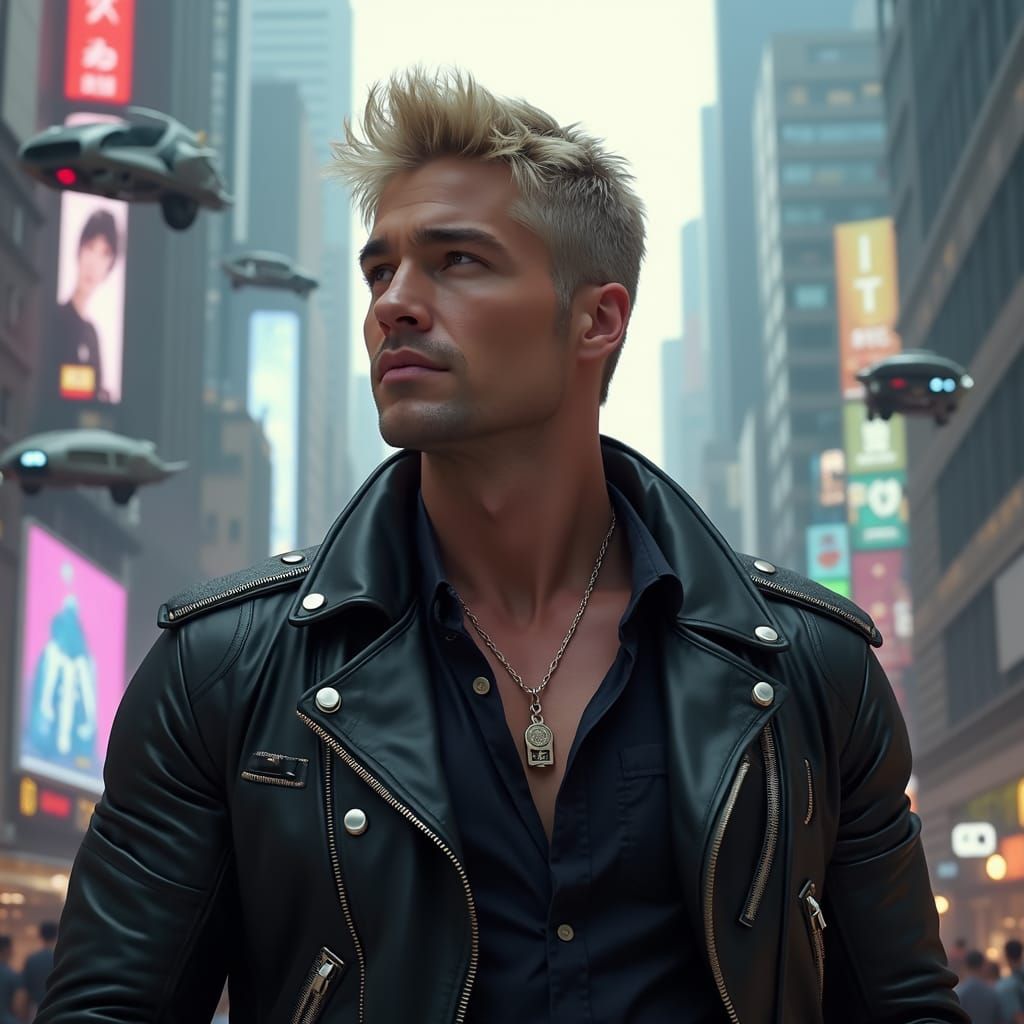 This image shows a confident man in a leather jacket in a futuristic city. The photorealistic digital artwork features towering skyscrapers, flying vehicles, and neon lights, with a shallow depth of field.