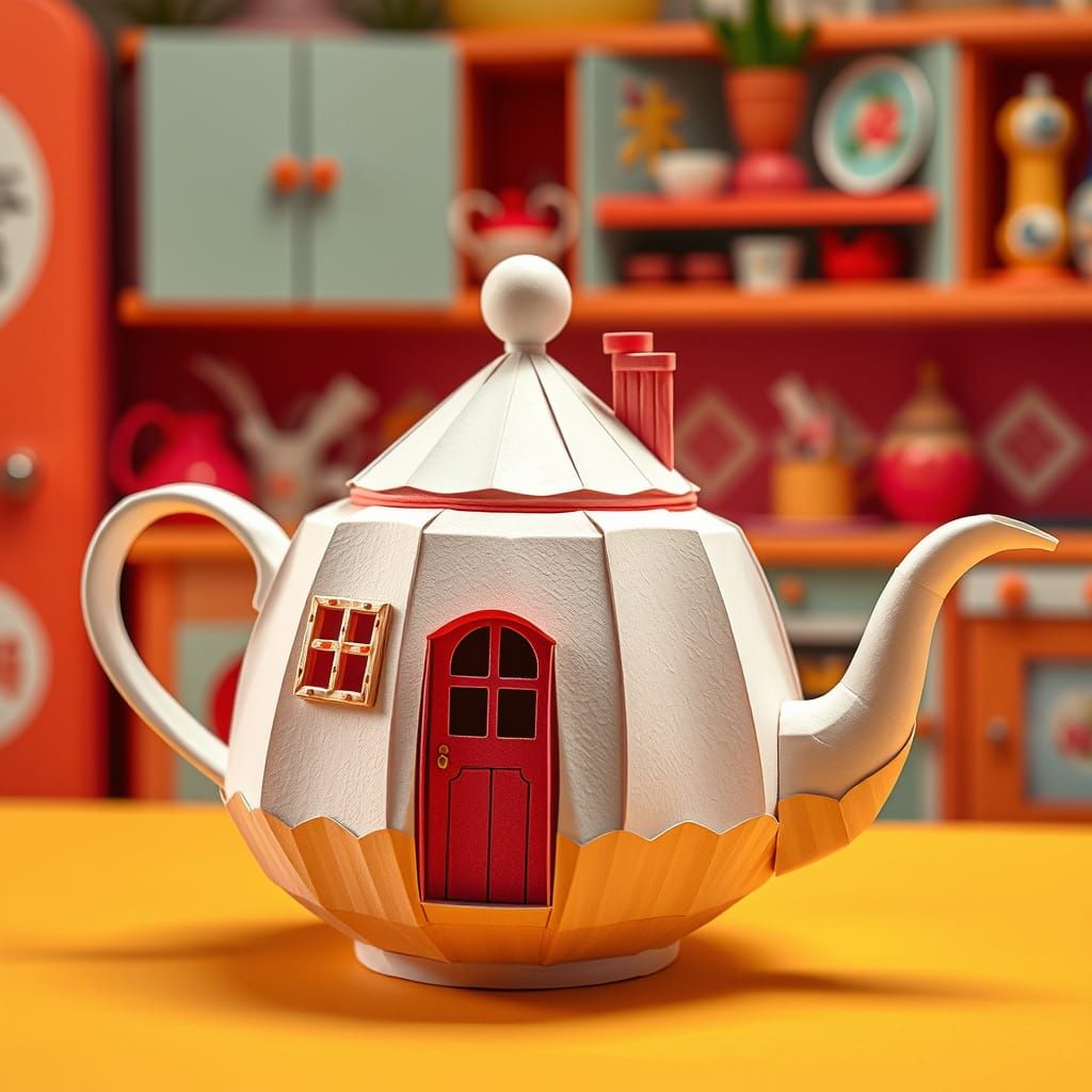 This image showcases a whimsical teapot with origami folds, resembling stationery paper, in a colorful kitchen. It features a tiny door, windows, chimney, and balcony, rendered in a detailed papercraft style.