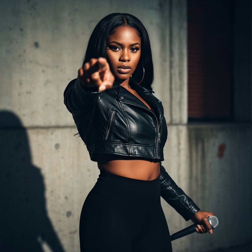 A striking image of an African-American woman in a leather jacket posing for a hip-hop album cover. Features moody lighting, urban backdrop, and commanding presence.