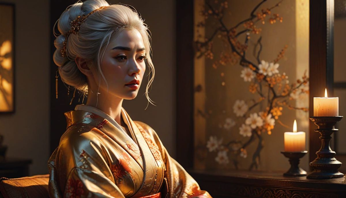 A sorrowful geisha sits in a candlelit room, tears flowing into her long white hair. The image is a detailed 3D render with soft, golden light and high contrast.