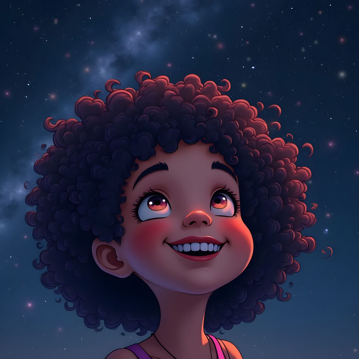 This image shows a girl's head outlined against a cosmic night sky filled with stars and colorful lights. The girl has a laughing smile, round face, and wild curly hair filling the sky.