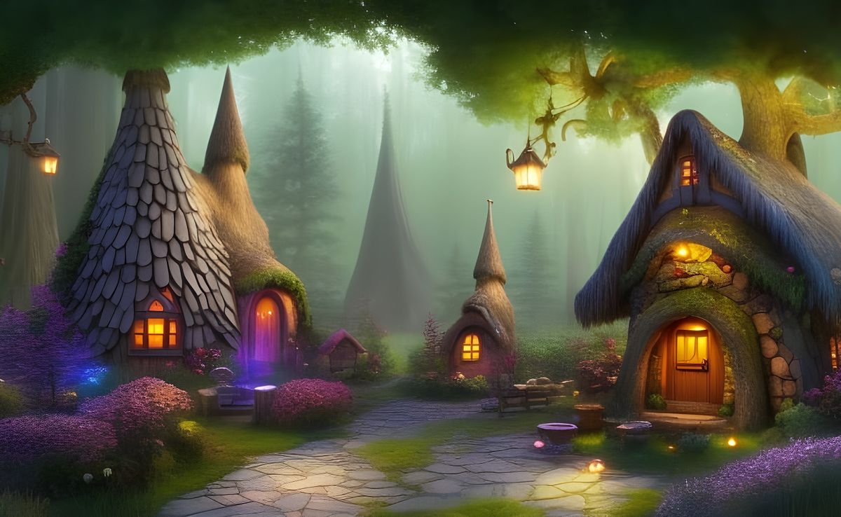 focal point gnome cottage built into the trunks of enchanted trees, muted colors, shimmer lights, swirling lights