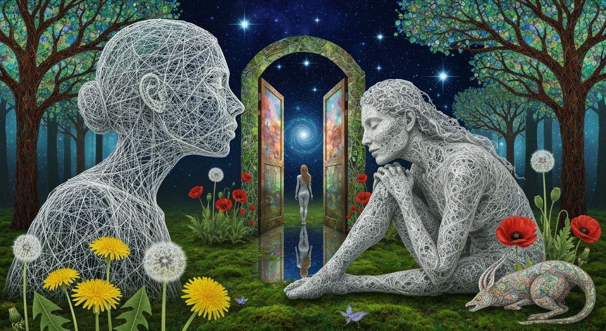This image shows a beautiful woman made of strings kissing a garden, representing themes of environmental connection. The scene, in a transhumanist style, features a weathered prince resting amidst dandelions and poppies.