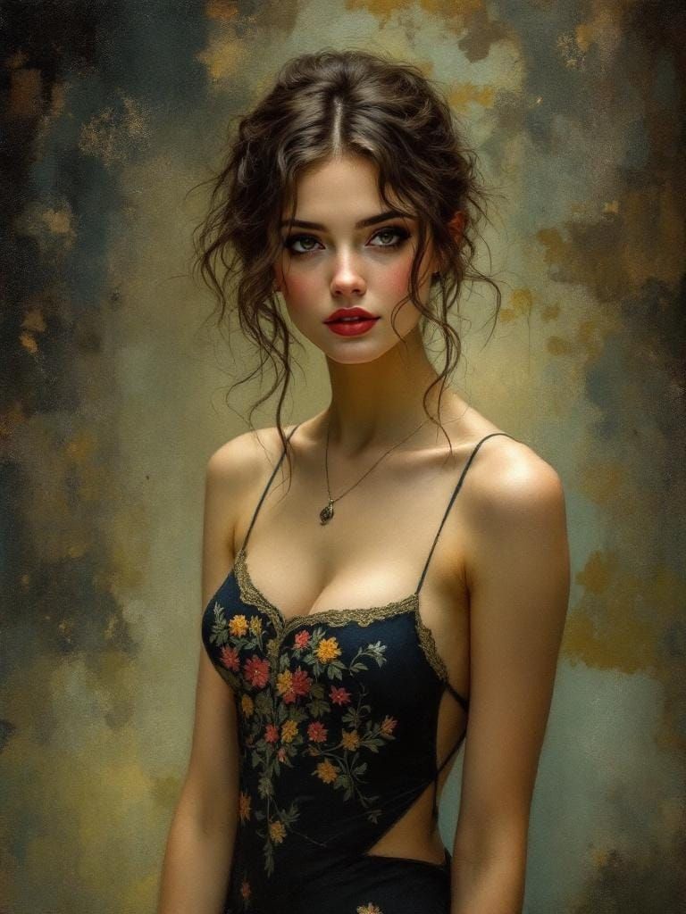 A captivating image of a woman in an embroidered dress, reminiscent of 1950s Russian fashion. The artwork features idealized naturalism and soft, atmospheric backgrounds in a tonalist style.