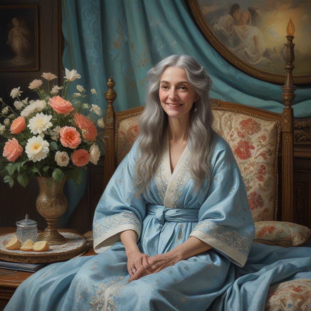 This dreamlike oil painting features a smiling elderly woman in a vibrant quilt, sitting beside a floral octopus. An ancient king observes them in a whimsical, dreamlike scene with textured brushstrokes and soft lighting.