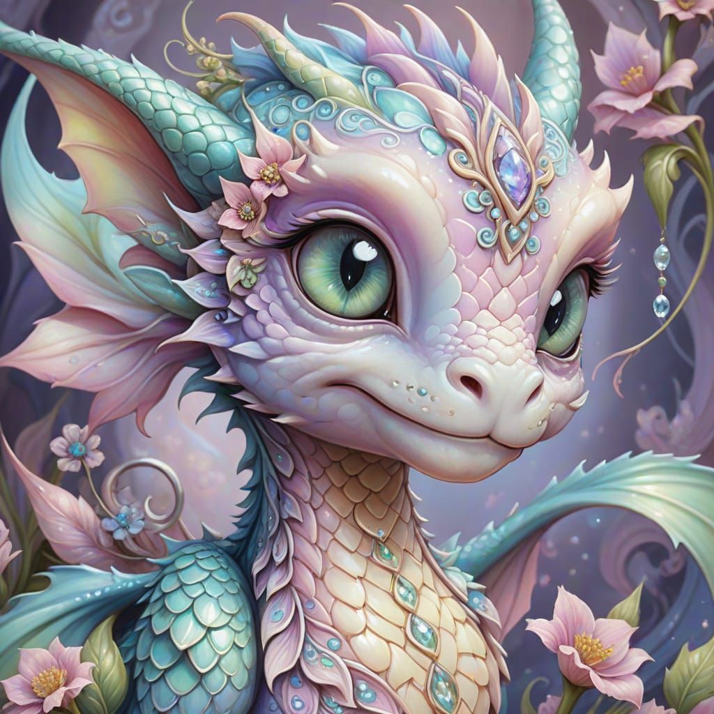 This image shows a whimsical, anthropomorphic baby dragon with shimmering pastel ombré scales, large expressive eyes, and ornate scrollwork. Rendered in a vibrant, art nouveau style with surrounding flowers and crystals.