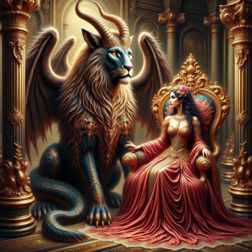 This image features a majestic chimera with lion, goat, and dragon features near a sorceress on a throne. Dark fantasy with liquid gold accents, vibrant colors, and flowing lines.