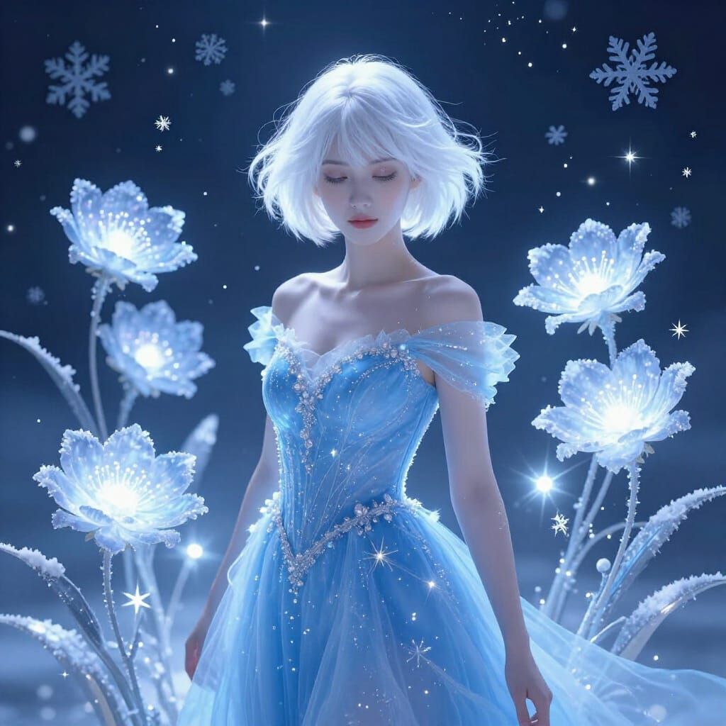 This image features a hyperrealistic concept art style with a woman with short white hair in a blue dress surrounded by glowing magical flowers and snowflakes. It has dynamic, volumetric lighting and intricate details.