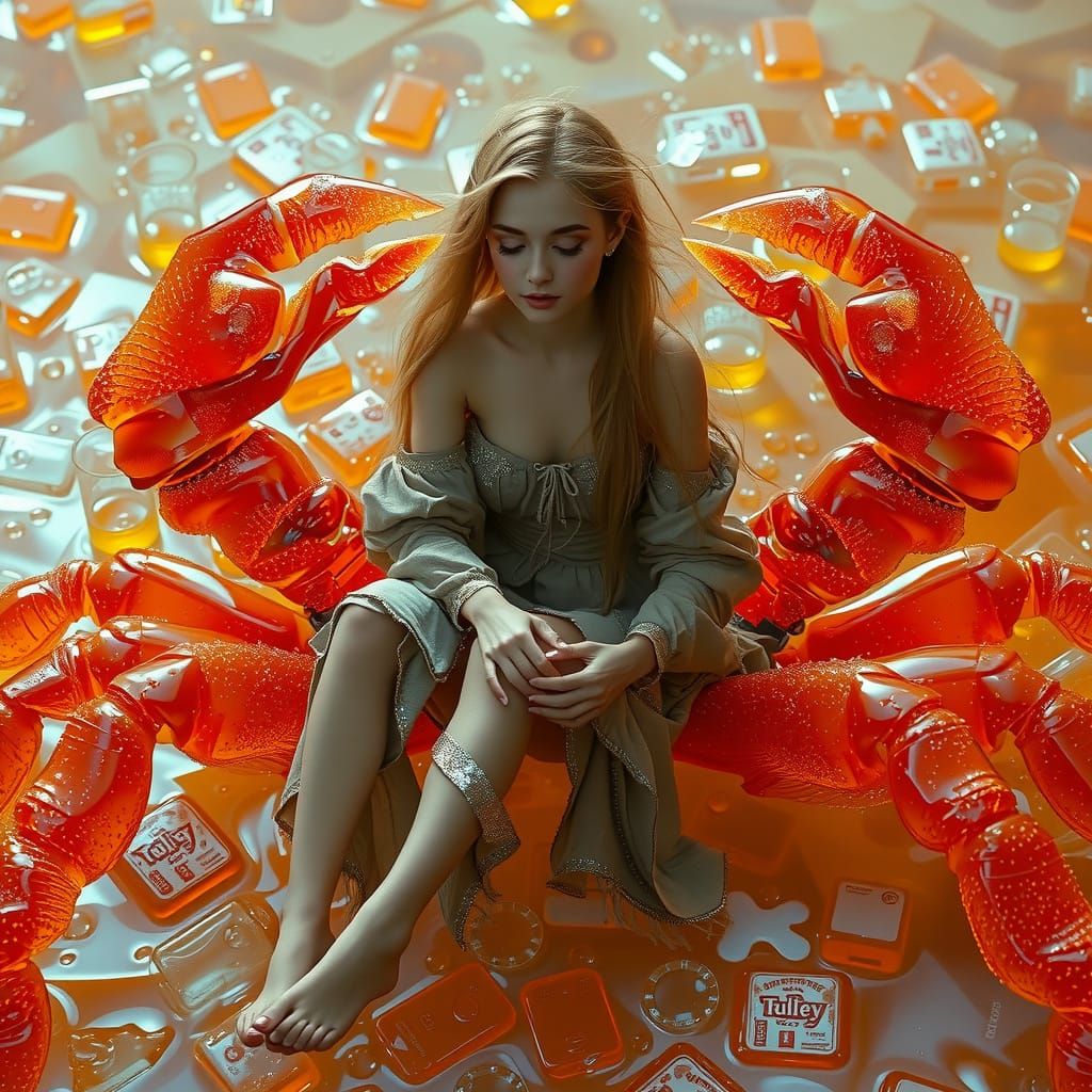 A dreamy image of a young woman with golden hair sitting on a gummy crab. The sea around them is fizzing soda, with warm amber, tangerine, and bronze colors and a neon glow.
