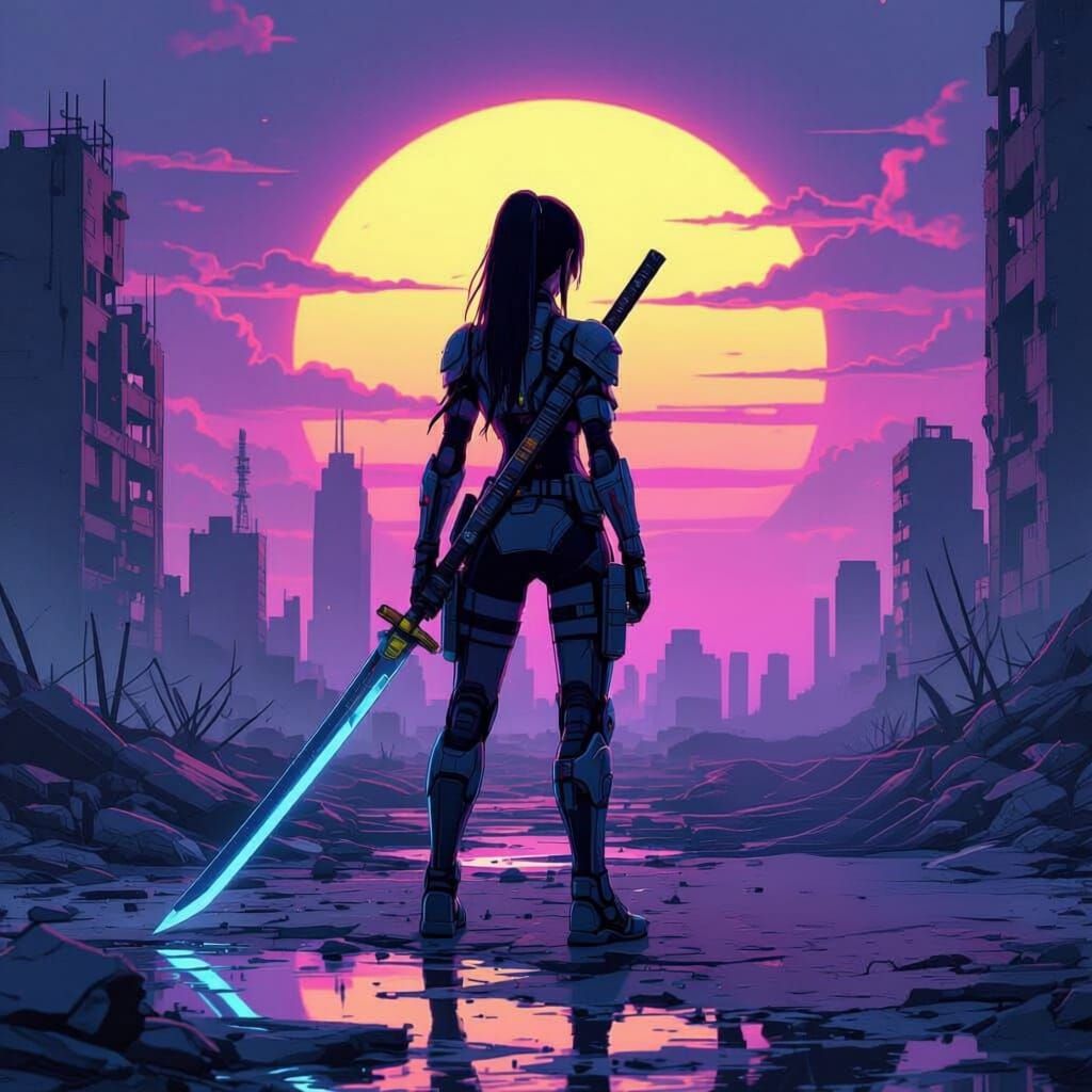 This image showcases a futuristic female ninja and her armored dog observing a post-apocalyptic city during a vibrant purple sunset, rendered in a retro anime style.