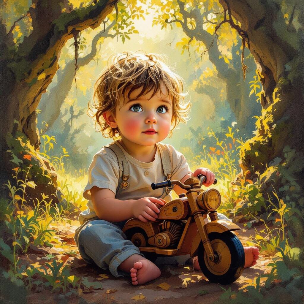 This impasto painting showcases a child with bright eyes holding a carved wooden toy motorbike in a magical, sun-dappled forest clearing. Inspired by textured, vibrant art styles.