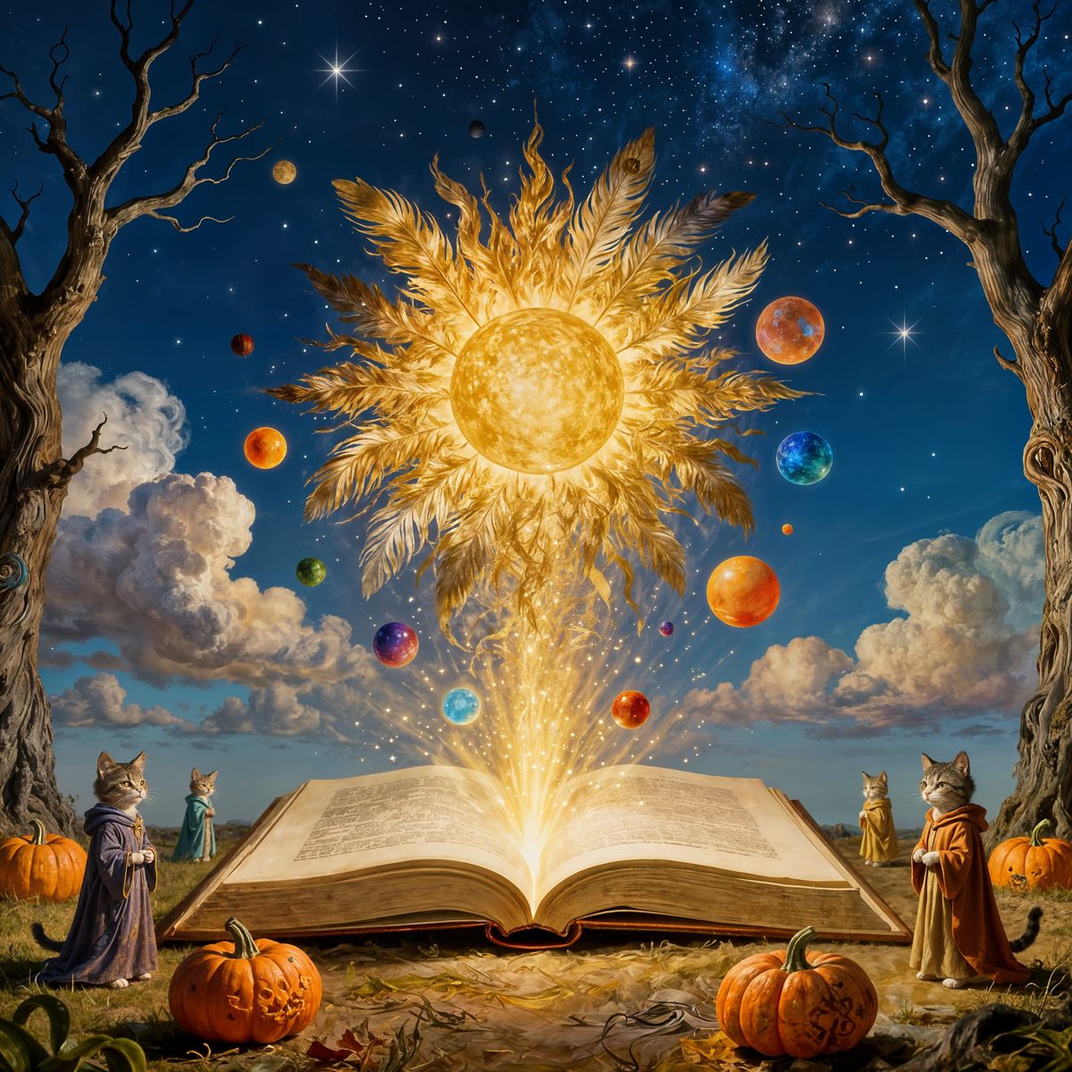 A surreal image of an open book radiating golden light, transforming into a sun with feather rays. It features colorful orbs, cat figures, pumpkins, and barren trees against a starry sky, rendered with intricate detail.