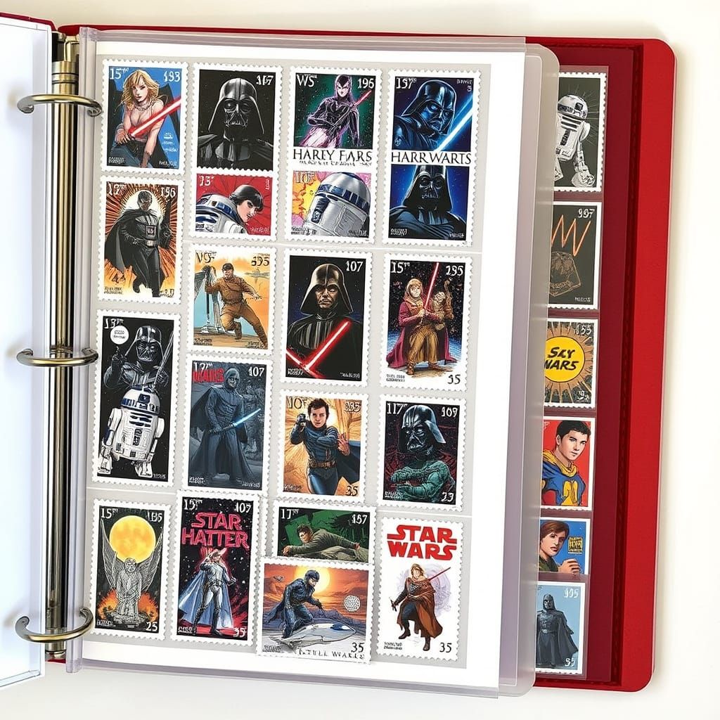 This image showcases a binder filled with diverse postage stamps, featuring popular themes from Star Wars, Marvel, Harry Potter, and DC Comics.