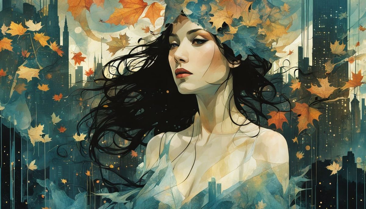 This image features a silhouette of a princess's head, intricately detailed. A galaxy seems to pour into a vibrant cityscape with trees and streetlights, accented by falling autumn maple leaves.
