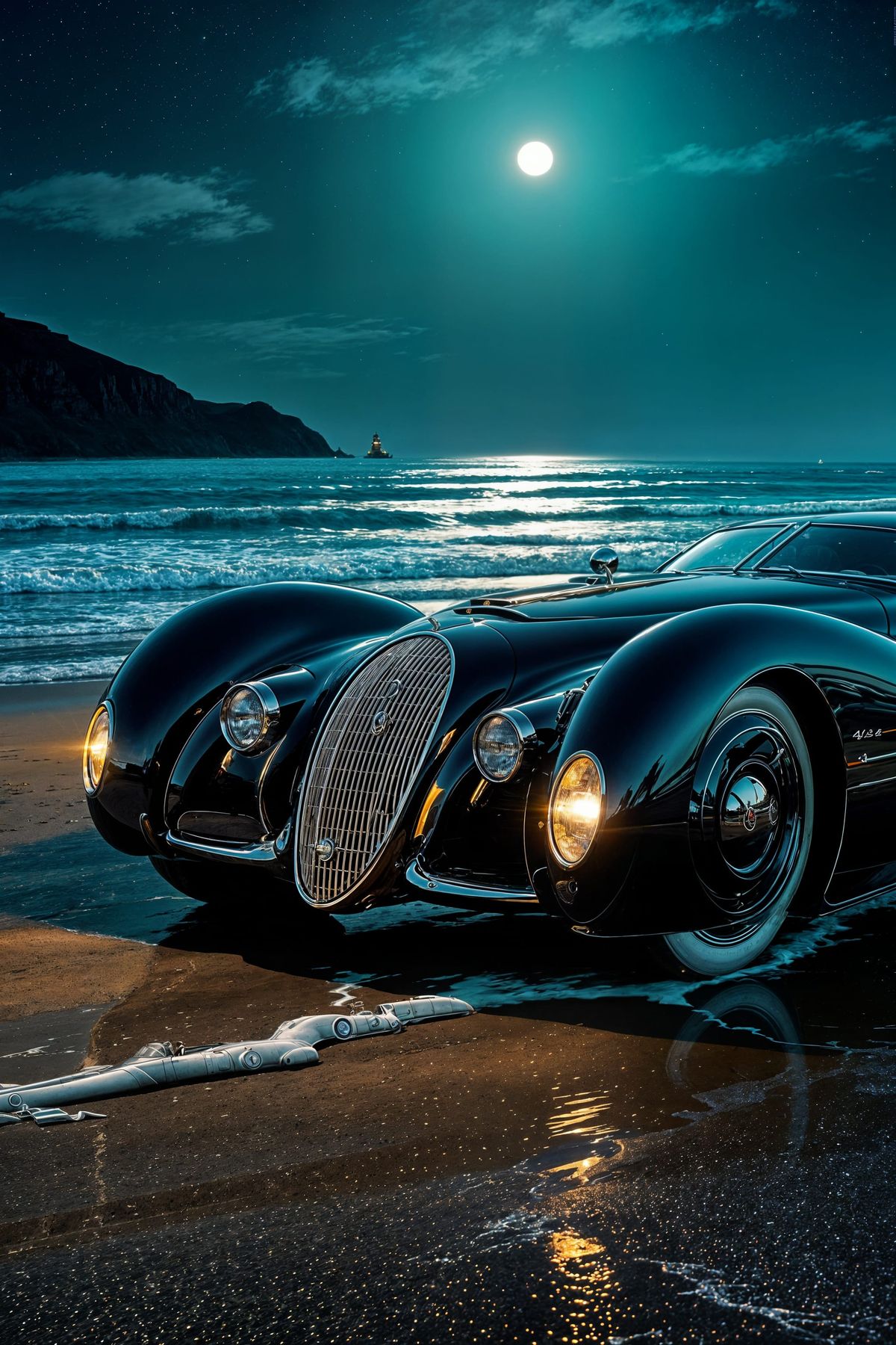 A striking picture of a vintage sports car parked on a beach at night. The vehicle has been reimagined with art deco curves and chrome details. The overall aesthetic is painterly, reminiscent of classic travel posters.