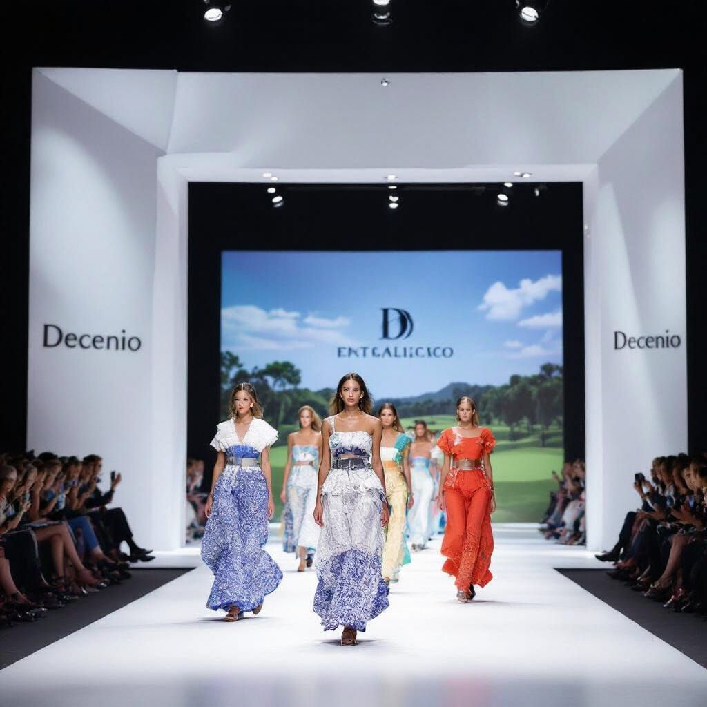 This image depicts a high-resolution fashion show for the Decenio brand, featuring models walking on a runway with the brand's logo, set against a golf course backdrop. The scene uses dramatic lighting and vibrant colors, captured in a dynamic, elegant style.
