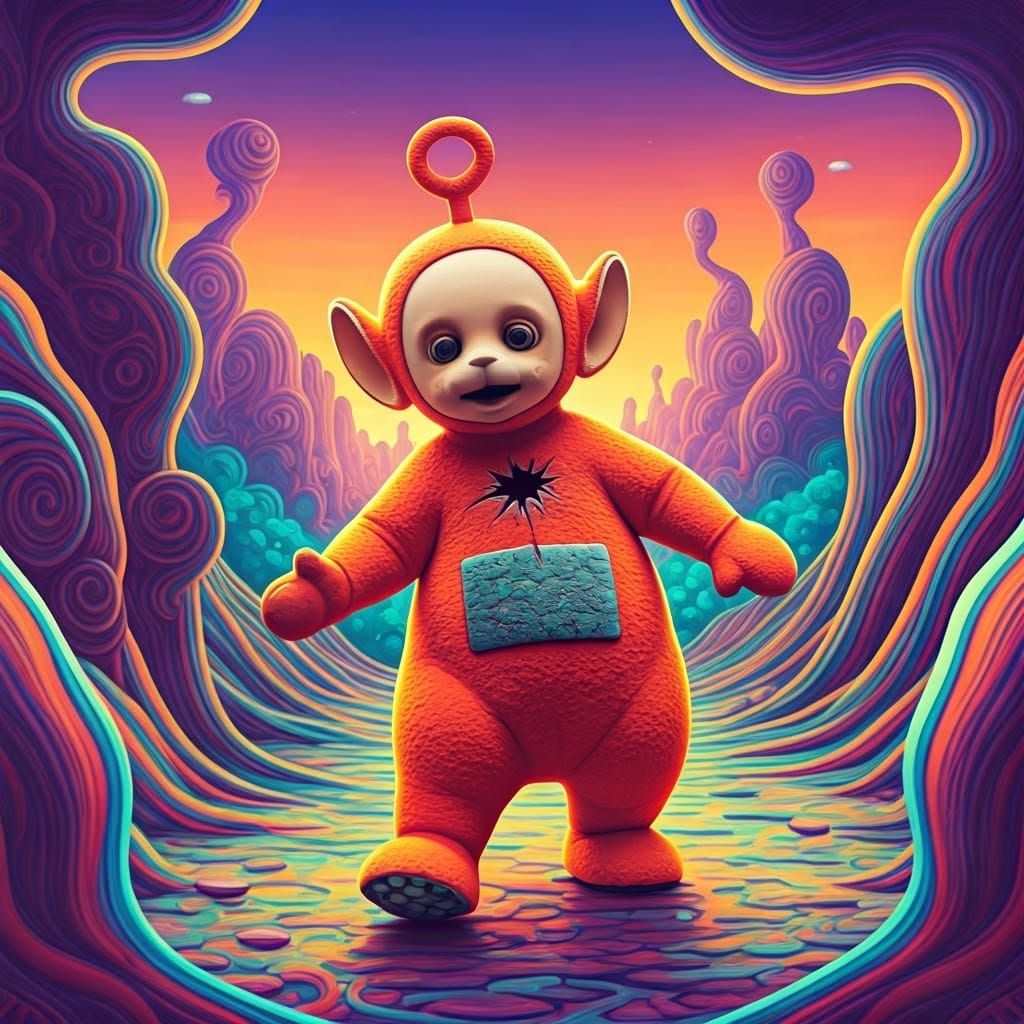 This image shows a disoriented Teletubby amidst a kaleidoscope of colors and abstract shapes, with a torn antenna and a confused expression, blending futuristic and whimsical elements.