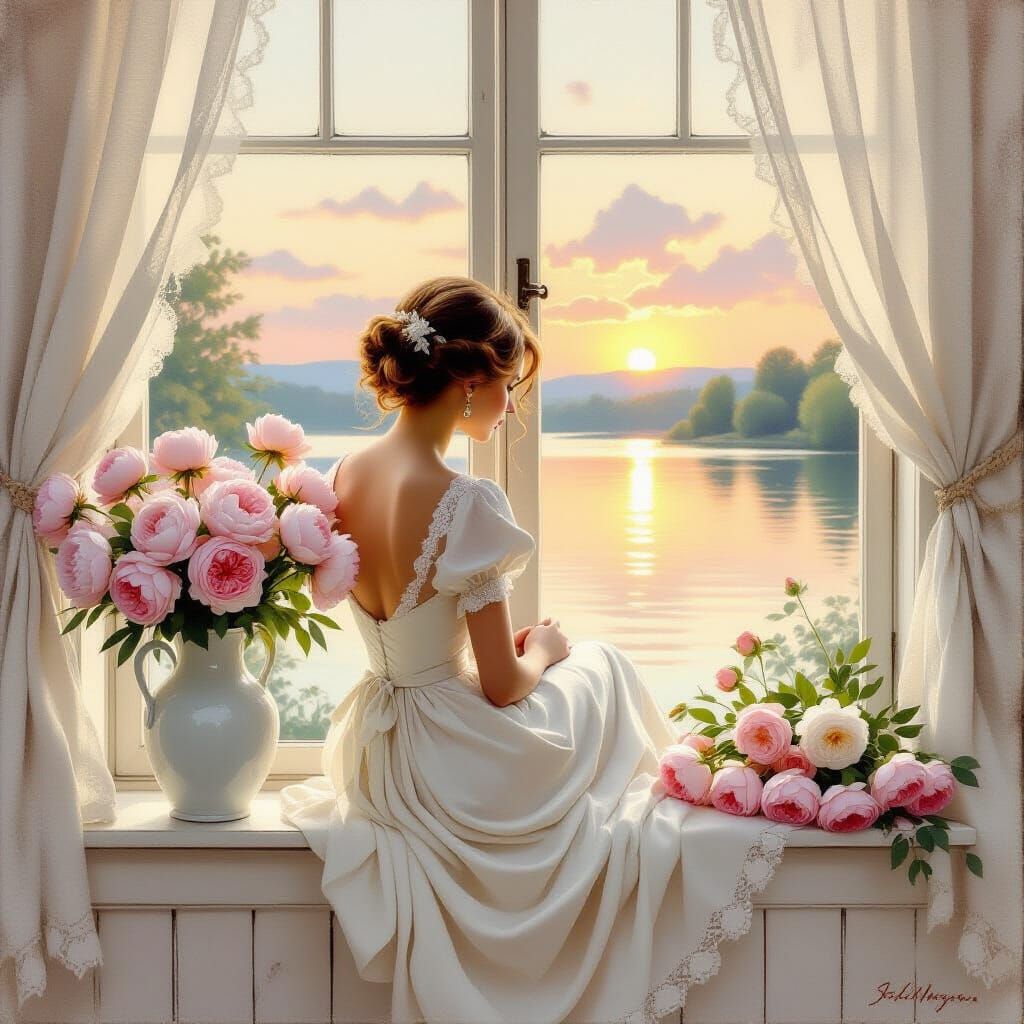 This image shows a woman in white dress by a window with flowers. A serene lake reflects the setting sun in a romantic, whimsical style.