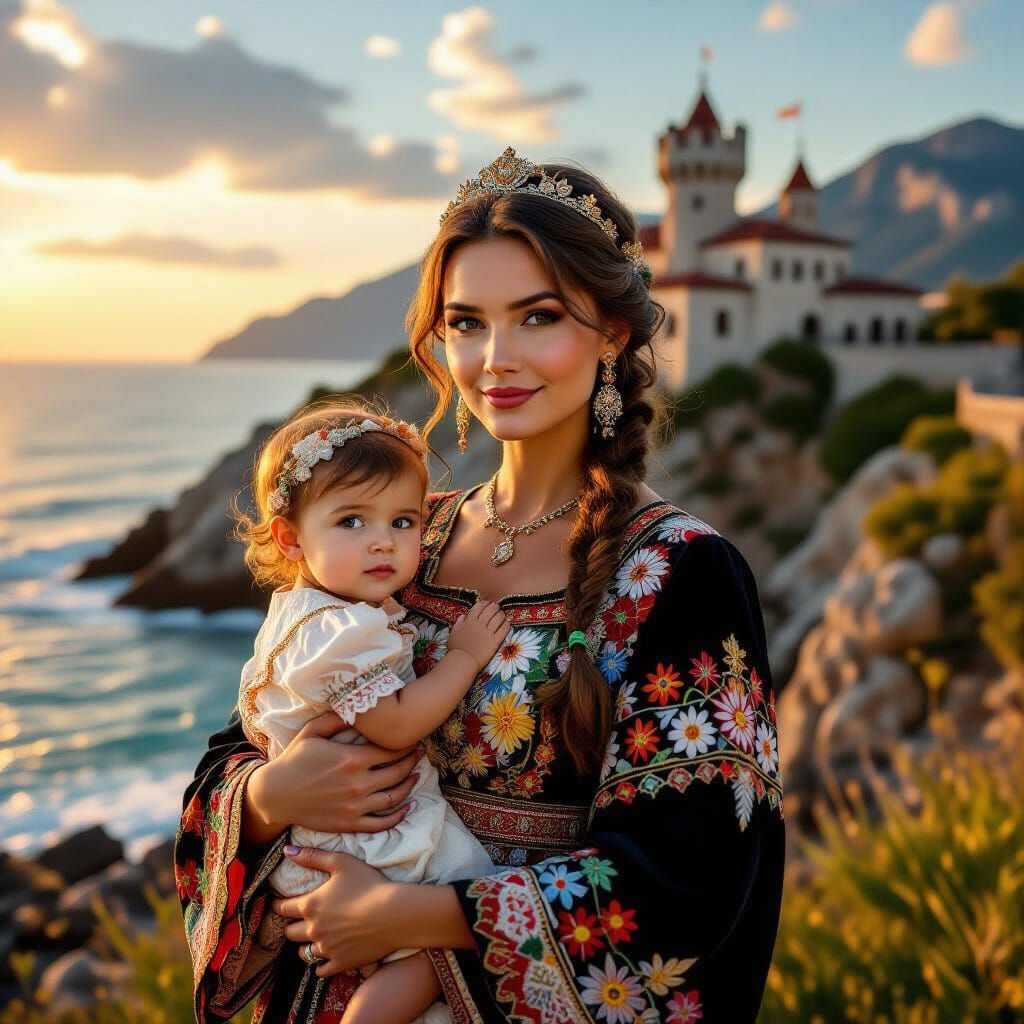 This image depicts a proud Ukrainian woman in an ornate embroidered dress holding her child. The scene is set against the dramatic Swallow's Nest castle at sunset, overlooking the Black Sea. Captured in ultra-detailed, cinematic style.