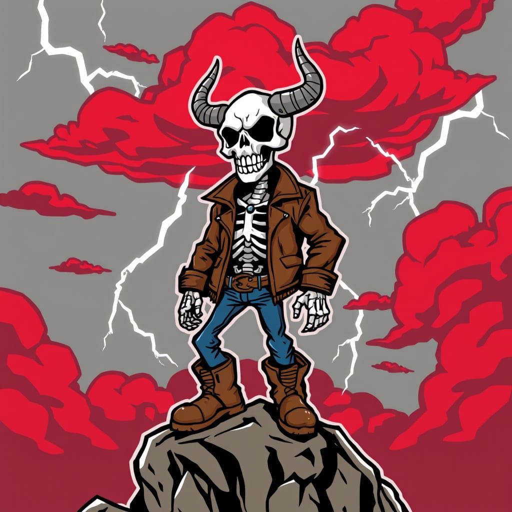 This image shows a bold skeleton character standing confidently on a rock, set against a dramatic backdrop of red clouds and lightning bolts, exuding a rebellious and powerful vibe in a cyberpunk aesthetic.