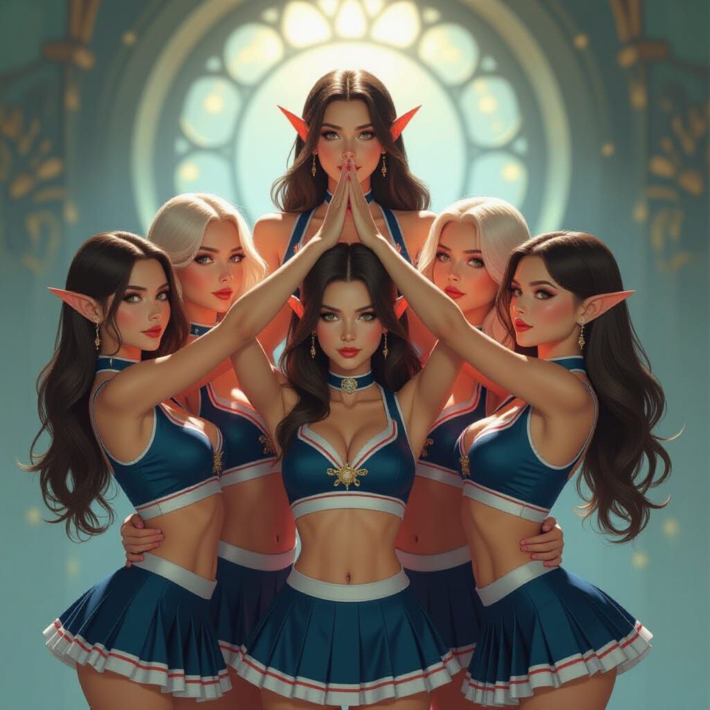 This image shows six elf women dressed as cheerleaders forming a pyramid. The head and shoulders portrait features hyper-realistic details and dynamic lighting with a blend of vibrant colors and sleek lines in an Art Nouveau style.