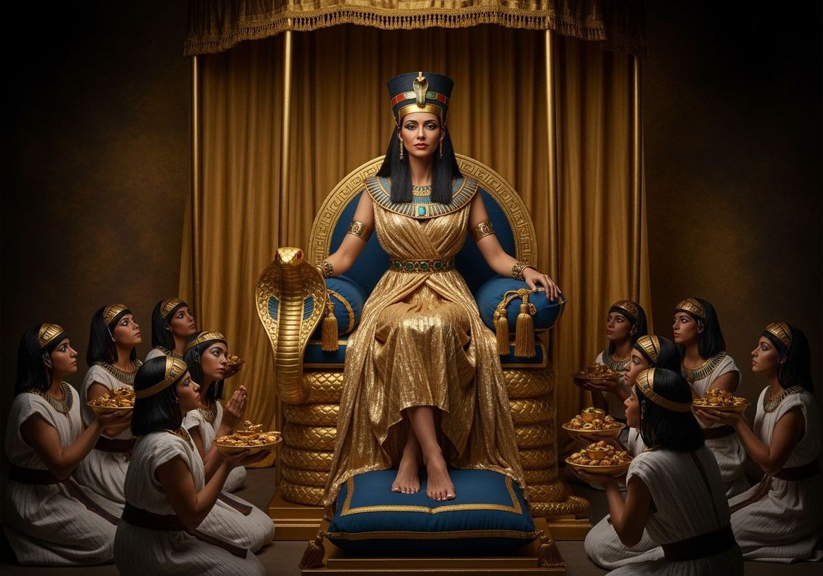 This image shows an Egyptian queen seated on a golden throne, with peasants kneeling before her. The portrait features a shallow depth of field and bokeh background, reminiscent of professional studio photography.