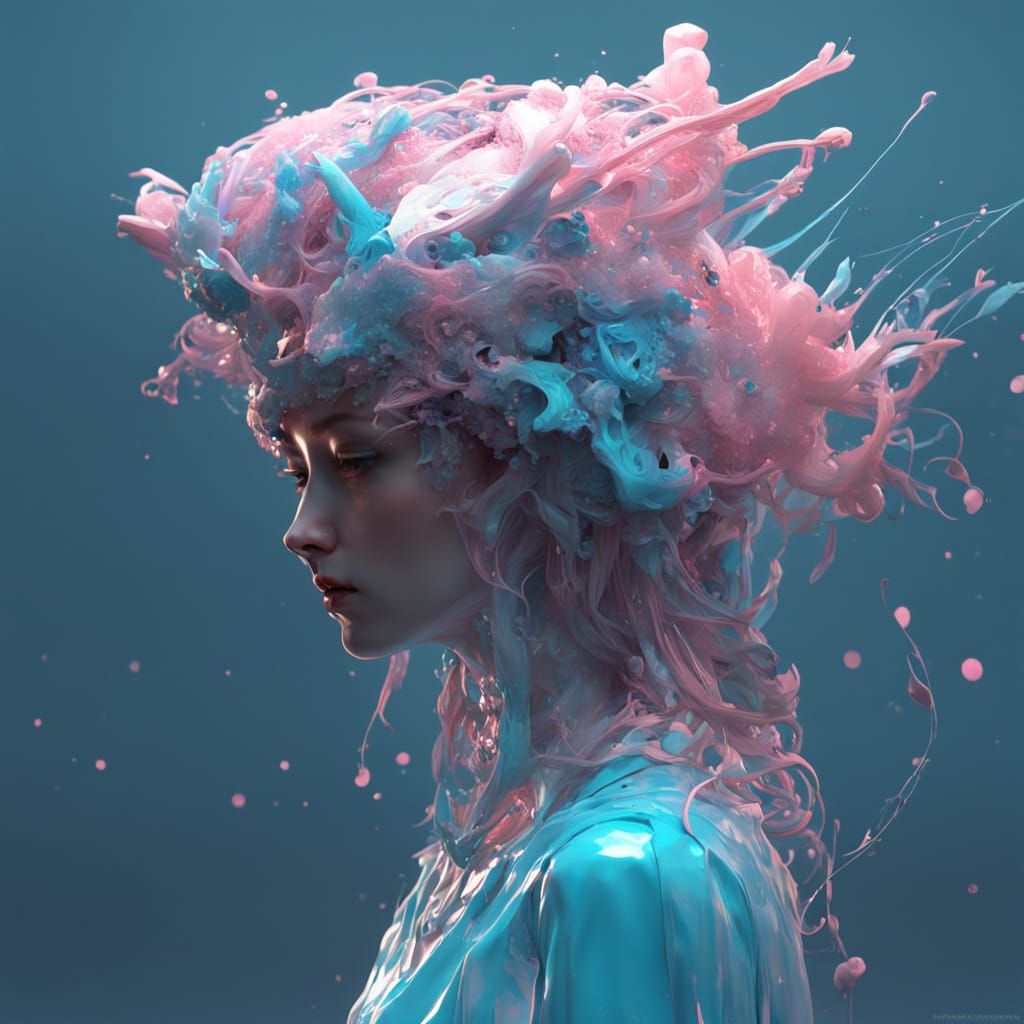This image showcases an intricate 3D abstract sculpture featuring a liquid headdress with pastel pink and cerulean elements. The design melts smoothly, creating a delicate and beautiful visual.