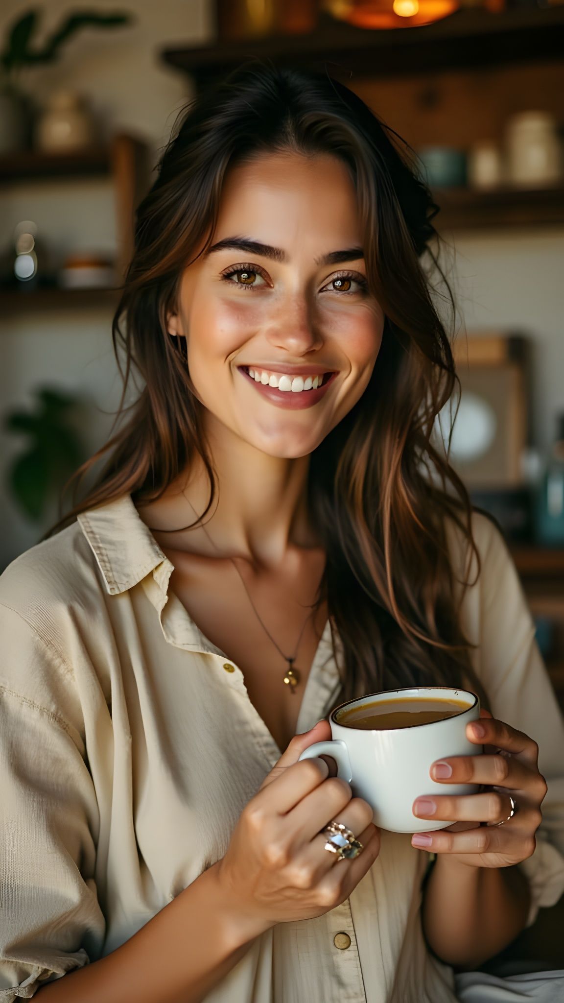 This image captures a serene moment of a woman surrounded by simple comforts, exuding a sense of peace and new beginnings, set against a natural color palette reminiscent of realistic photography.
