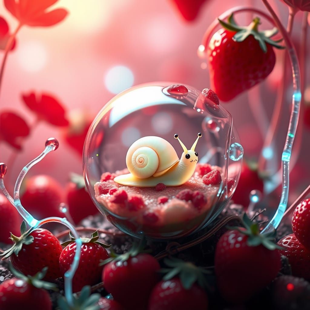 This image shows a cute and adorable snail suspended in a surreal, living landscape of juicy red strawberries and glowing bioluminescent tendrils, set against a 4D tesseract backdrop
