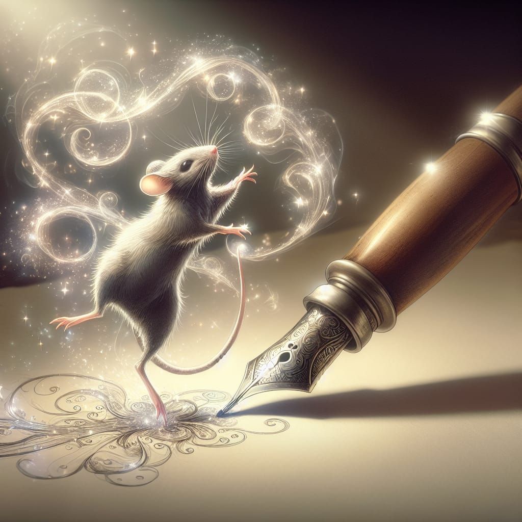 This image shows a dancing mouse emerging from a magical pen's arcane energy on paper, rendered with detailed linework and soft, enchanting light.