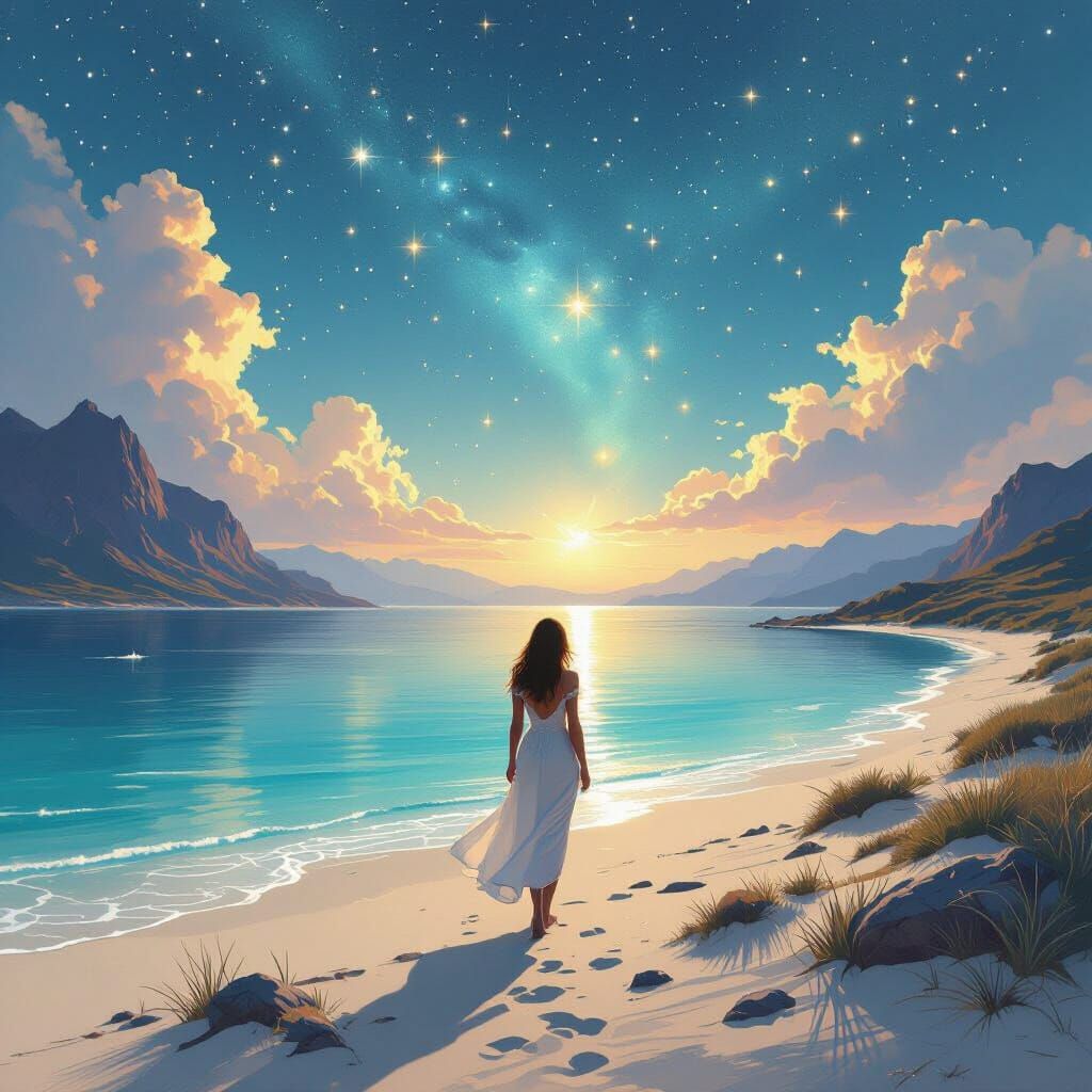 A striking picture of a woman in a scenic landscape on a peninsula. The image features turquoise water, white sand, mountains, and a sky with blue, pink, and yellow hues. Rendered as detailed digital art.