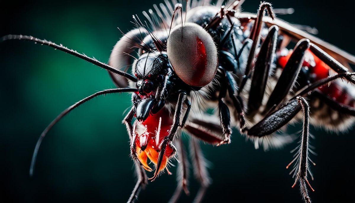This image shows a macro photograph of a frightening mosquito in a horror setting. The close-up details the mosquito's skin, fangs, and blood, enhanced by vibrant colors and sharp focus.