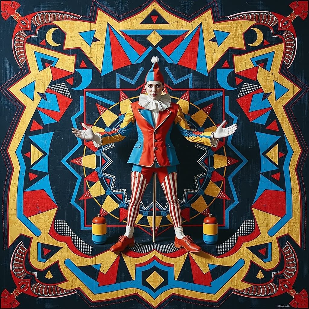 This image features a colorful harlequin figure surrounded by a hypnotic visual maze with intricate geometric patterns, creating an optical illusion that blends the harlequin into the background