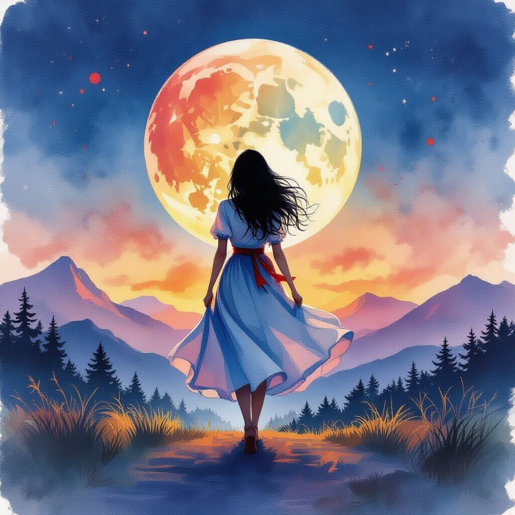 This image shows a woman with long black hair in a flowing dress, standing with her back to the viewer under a dramatic night sky. The scene is rendered in soft, blended watercolor style.