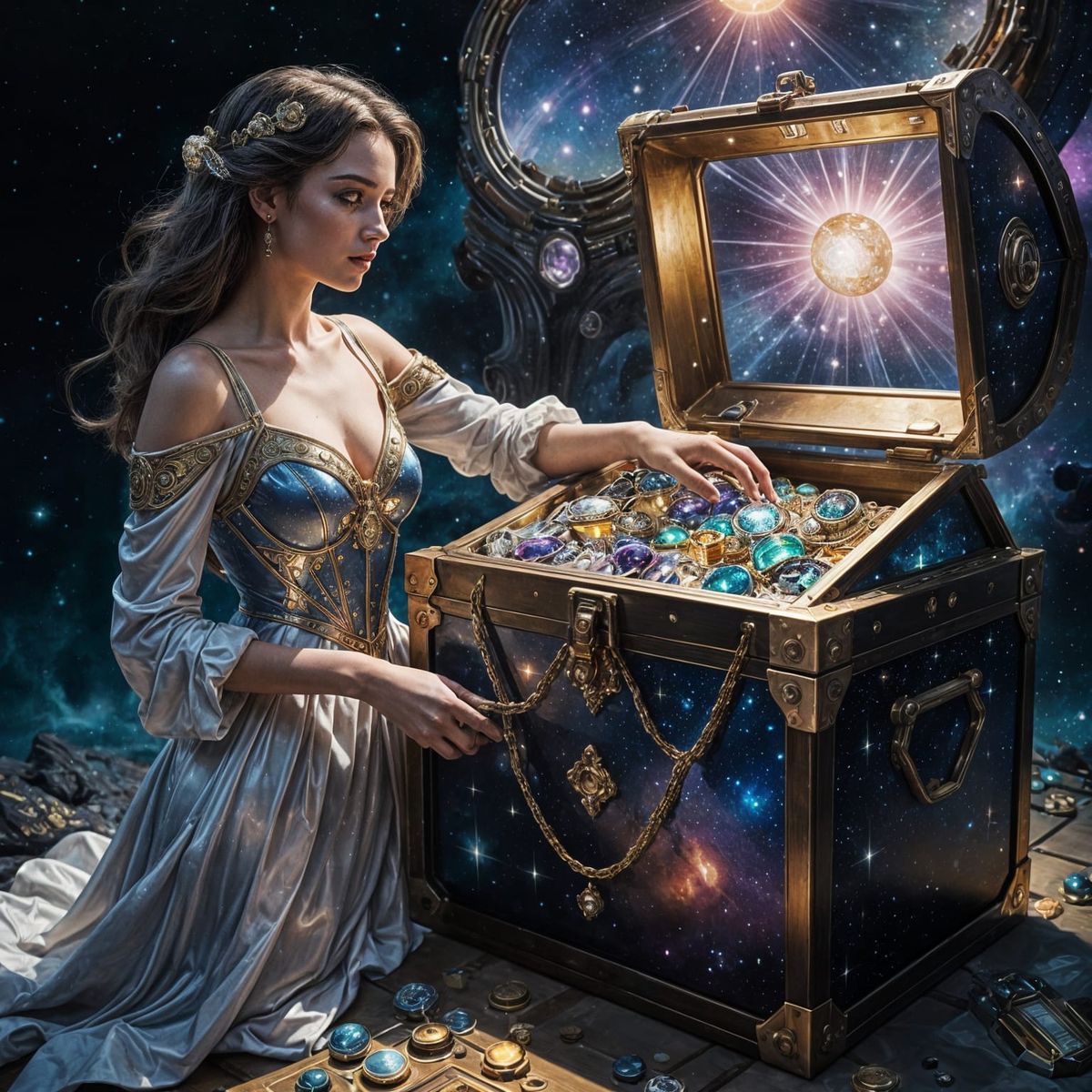 This image shows an elegant woman in a futuristic dress amidst a space ocean. The scene is illuminated with soft light, featuring clockwork mechanisms, gemstones, and glowing alien artifacts in a retro-futuristic style.