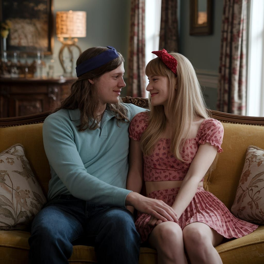 This image shows a couple sitting on a couch in a cozy vintage living room, looking at each other. The scene is captured in a cinematic film still style with atmospheric lighting and film grain.