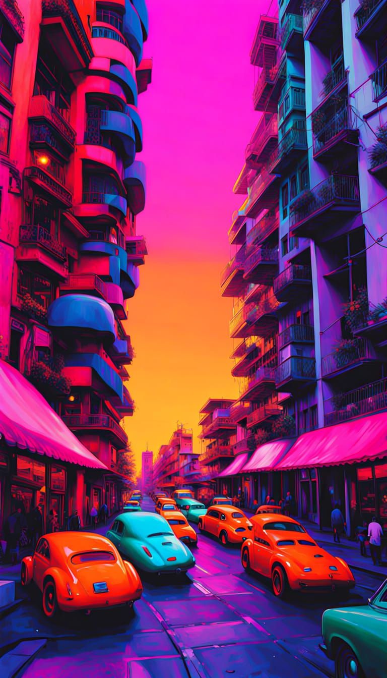 This image showcases an absurd scene rendered with meticulous detail, holographic parallax effects, and bright, fluorescent neon colors. The composition features contrasting colors and elements of surrealism in a digital art style.
