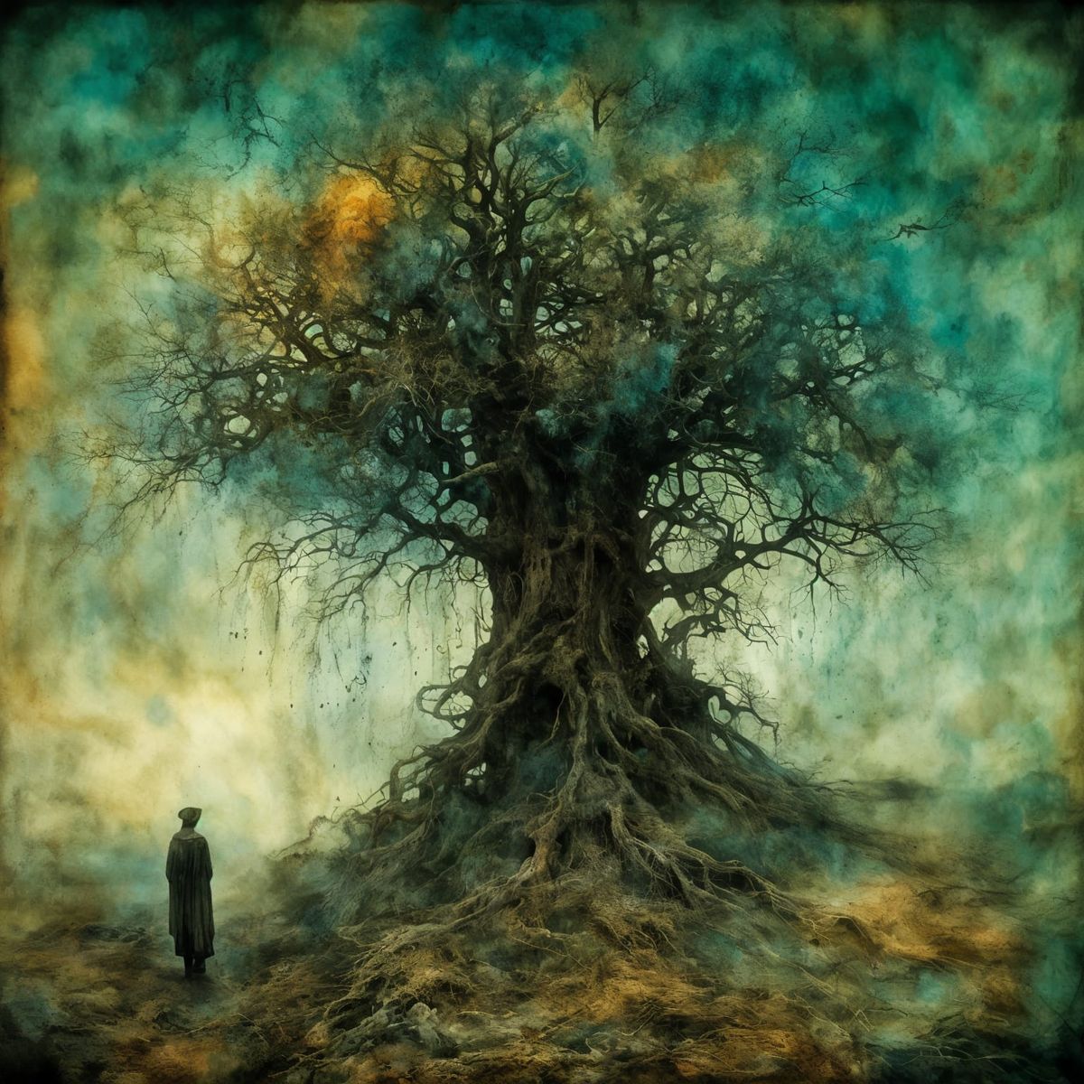 A haunting image of a ghostly tree silhouette, suspended in a dreamlike state, with a sense of wise and distant introspection. Created in an abstract surrealist style with elements of hyperrealism and iridescence.