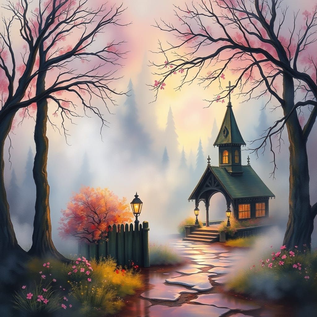 Bring your imagination to life with our free AI image generator. Easily create your own fantasy landscapes in a style reminiscent of Thomas Kinkade.