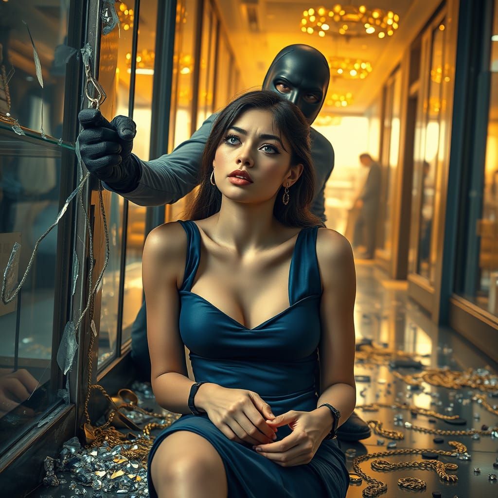 This image shows a dramatic, photorealistic scene of a luxury jewelry store in disarray, with a young salesgirl bound and terrified, and a masked robber looming over her, as warm golden light pours in through shattered windows, refracting off scattered diamonds and gold chains.