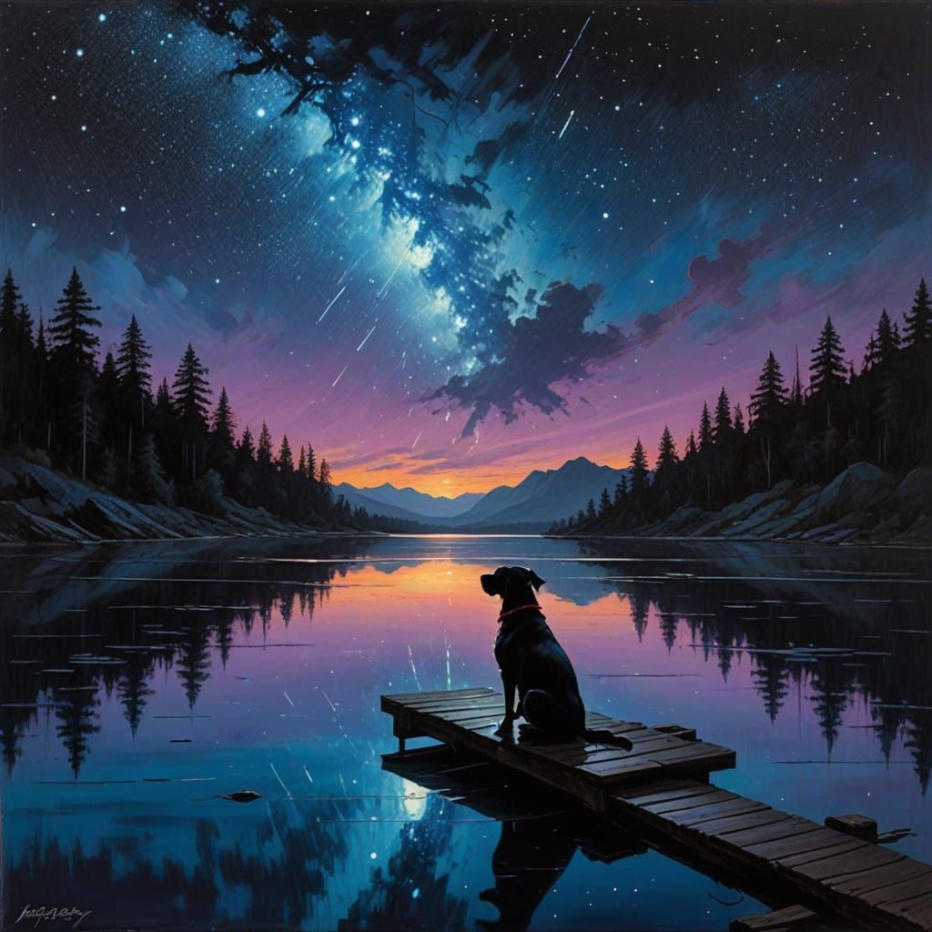"A breathtaking night scene featuring the silhouette of a lone dog sitting at the edge of a wooden dock, gazing up at a stunning meteor shower. The sky is filled with streaks of glowing meteors in shades of blue, purple, and silver, illuminating the calm lake below. The water reflects the celestial display, ...