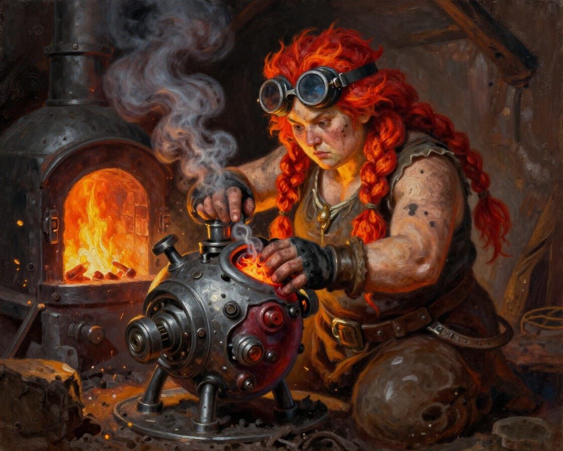 This image features a stocky gnome woman with fiery red braids, intensely working on a mechanical golem's steam-heart in an underground forge. Rendered in an oil painting style with impasto textures and dramatic lighting.