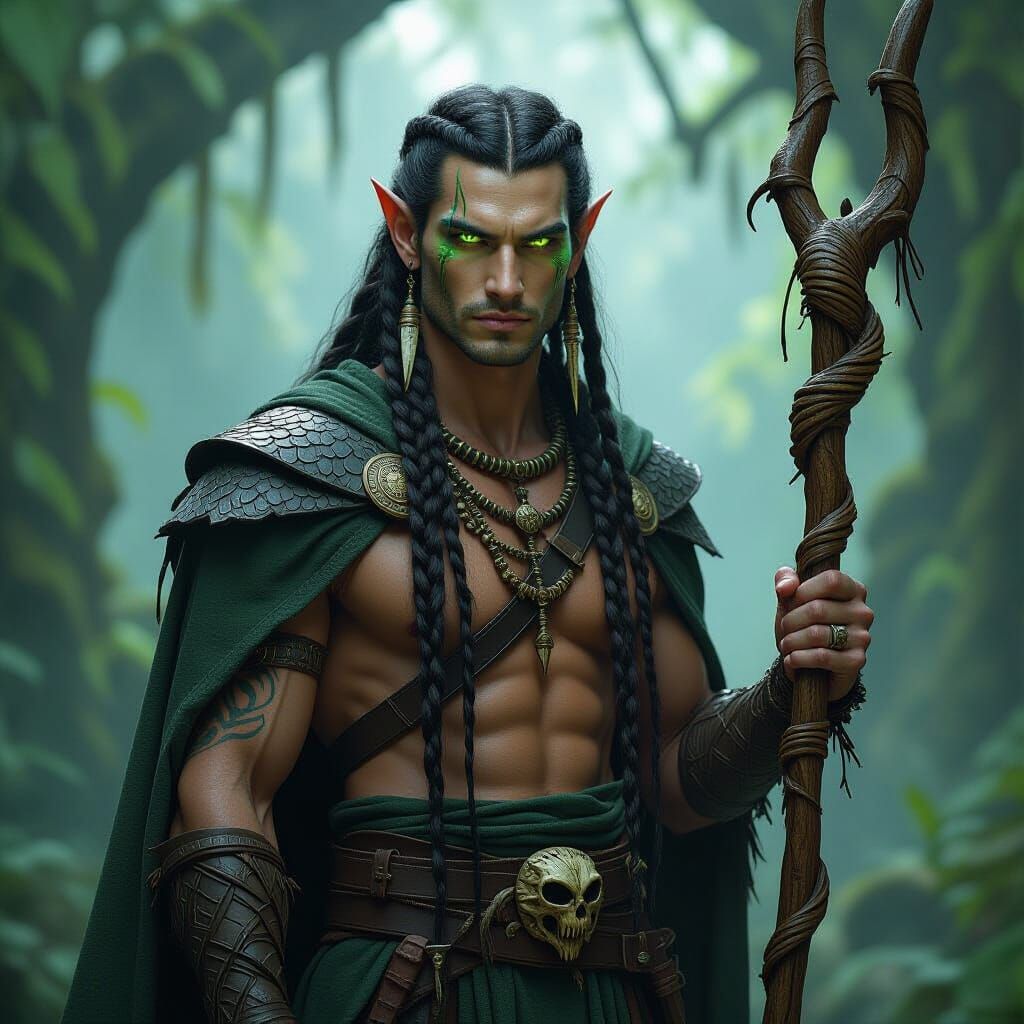 A photorealistic image displays a handsome male Yuan-ti druid in a misty forest. He wears snake leather armor and holds a wooden staff, with intricate textures and subtle iridescent scales.