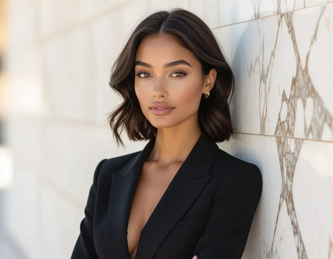 A striking picture of an elegant mixed-race woman posing professionally. The image features luminous caramel skin, wavy black hair and a chic neutral outfit, set against a marble building in golden light. This is ultra-realistic digital art.