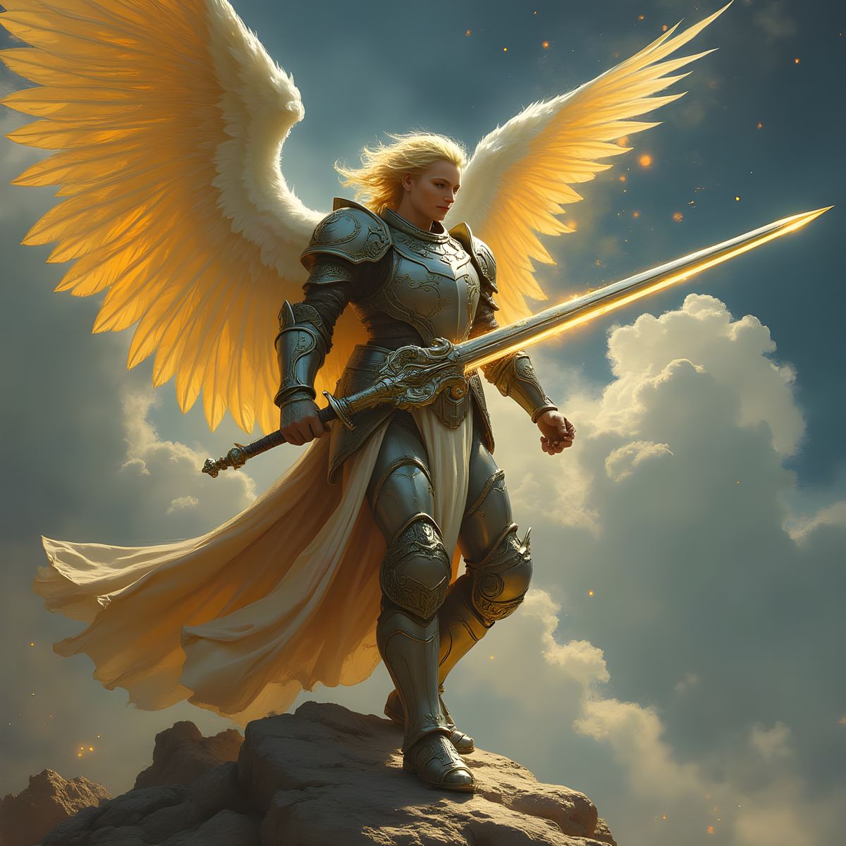 A digital painting of an armored warrior angel with a glowing sword, set against a stormy sky with banners. The image has a dynamic, industrial, and futuristic aesthetic.